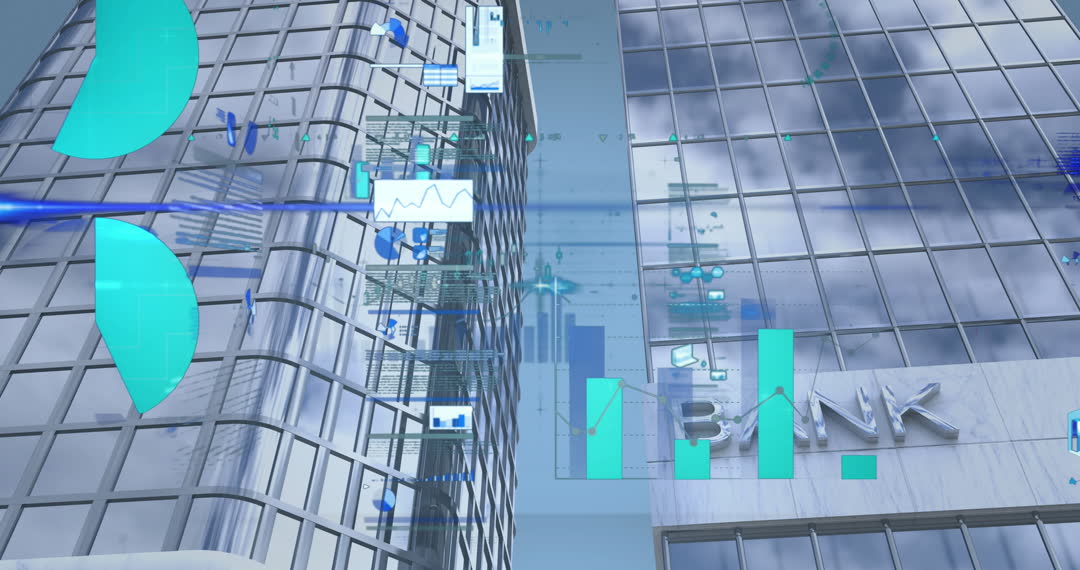 This illustration showcases layered digital data and statistical graphics overlaying modern skyscrapers, conveying concepts of financial analysis and data processing. Ideal for use in presentations on technology in banking, finance innovations, economic research, and digital transformation in business environments.