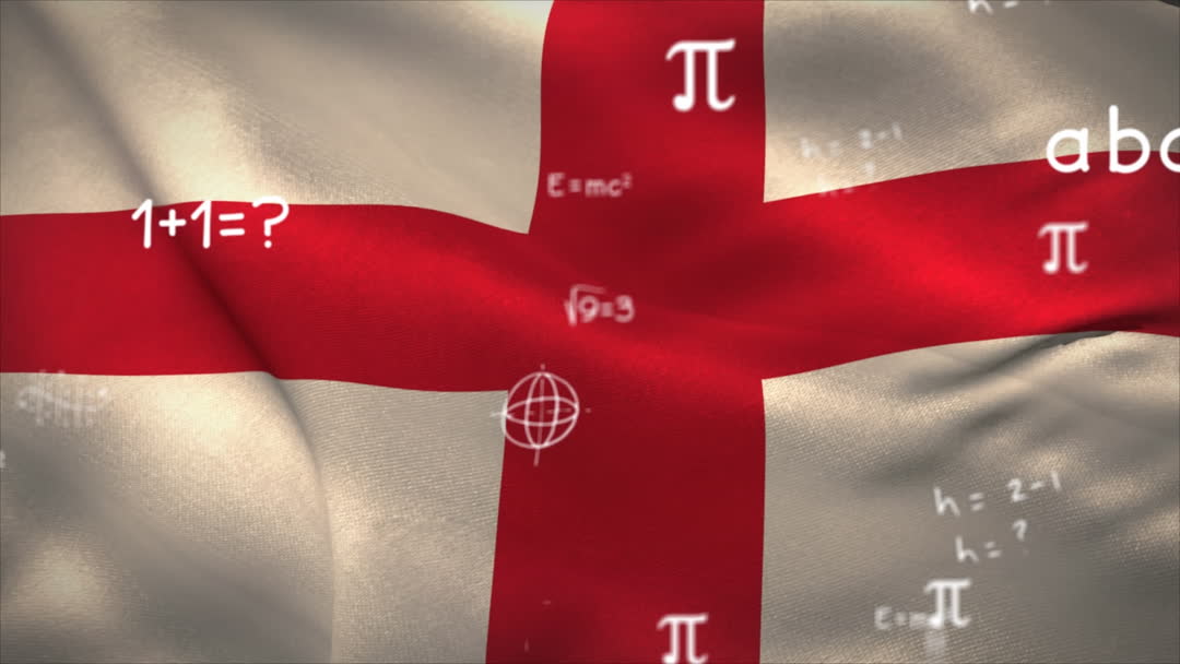 Visual depicting the digital integration of mathematics and data concepts superimposed on waving England flag. Highlights blend of traditional videory and modern science. Useful for education, tech events focusing on digital innovation, and features exploring national identity in relation to technology advancements.