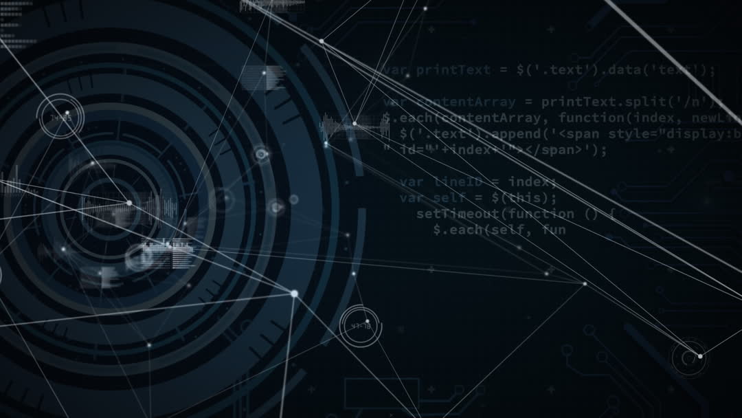 This animated scene of digital data flowing through a web of network connections provides a dynamic, futuristic background perfect for presentations on technology, cybersecurity, or global connectivity themes. The mixture of data streams and code creates a cybertech atmosphere suitable for tech industry content and visuals related to digital transformation.