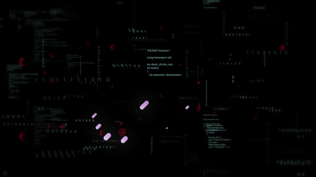 Animated scene featuring a glitchy visual of computer code and data elements on black background, evoking themes of technology, cyber dynamics, and information flow. Ideal for use in projects related to software development, cybersecurity stories, and digital transformation visual content.