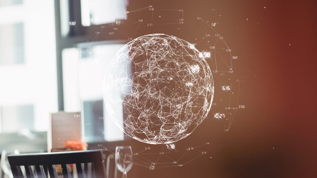 This video depicts a digital globe made of interconnected data points illuminating a restaurant interior, conveying themes of global business, technology, and data exchange. Perfect for illustrating concepts in digital transformation, culinary tech integration, or global communication network services. It best suits articles about technological innovation in hospitality, business presentations, or travel tech blogs.