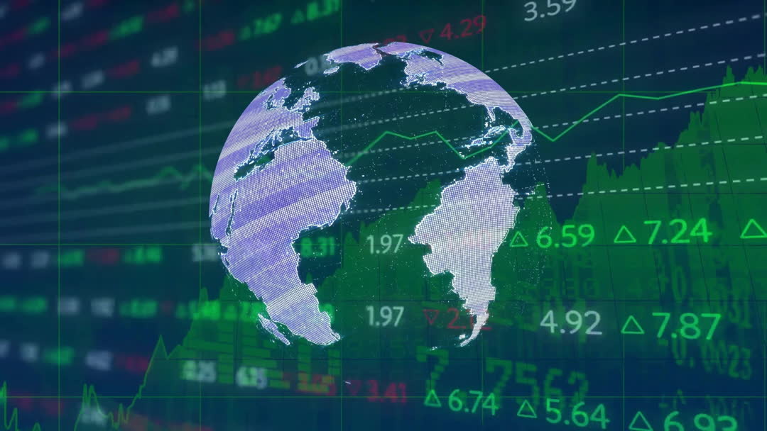 Dynamic animation showcasing a digital globe overlay on fluctuating stock market data and charts. Represents concepts of global business trends, data analytics, and technologically driven financial services. Useful for illustrating articles on financial growth predictions, market analysis insights, investment strategies, and the impact of digital technologies on global economic landscapes.