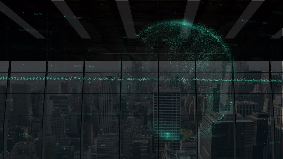 Data animation depicts digital globe pulsating over a city view, illustrating the impact of global connectivity and digital communication in modern business environments. Ideal for use in technologies, business innovation topics, or global communication themes. Can enhance content related to corporate hyperconnectivity, smart city representations, and cloud technology interaction.