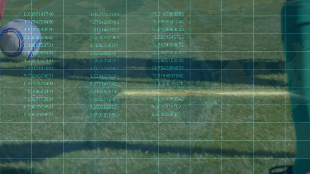 Financial data processing visuals overlap with a scene involving a football player during gameplay. This could symbolize the intersection of sports and financial Enterprise Resource Planning (ERP) systems. Perfect for illustrating the role of data analytics in enhancing sports strategies or funding in the global sports arena.