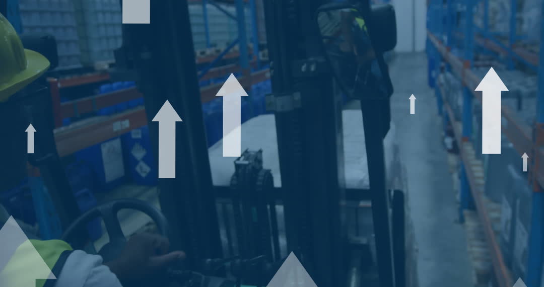 Overlay of digital data on a warehouse setting, featuring forklifts and storage areas. Ideal for illustrating concepts of technology infusion in logistics, supply chain innovations, or advancements in data-driven operations within industrial contexts.