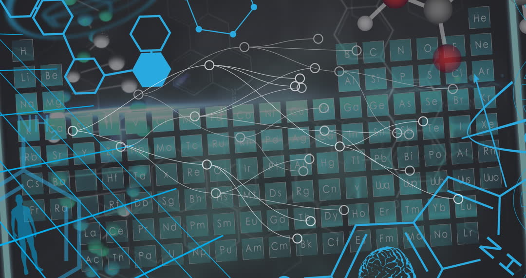 Illustrates a futuristic digital data connection combined with medical iconography and the periodic table. Suitable for illustrating articles or presentations on healthcare technology, digital health solutions, scientific research progress, and innovative cyber health interfaces, this abstract blend captures the intersection of technology and medicine.