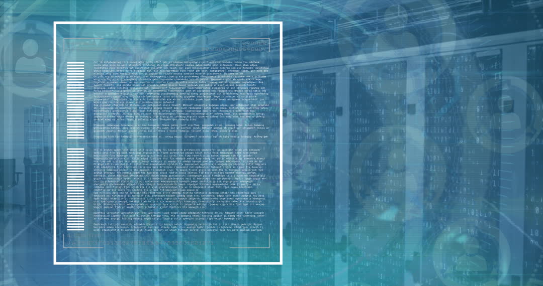 Visual representation of digital data processing overlaying a server room suggests modern technology application. Useful for illustrating technological advancements, big data, IT infrastructure, and networking concepts for articles, presentations, or website graphics.