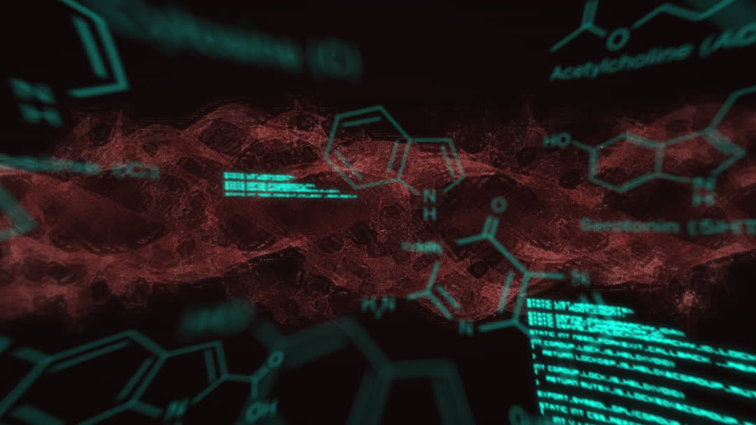 Animation showcasing a futuristic digital interface with data processing overlaid on flowing red wave patterns on a black background. The scene uses molecular structures and hexagon patterns evoking a sci-fi atmosphere. Ideal for presentations on technology advancements, science fiction concepts, or as dynamic screensavers depicting complex data analysis in digital and scientific ventures.