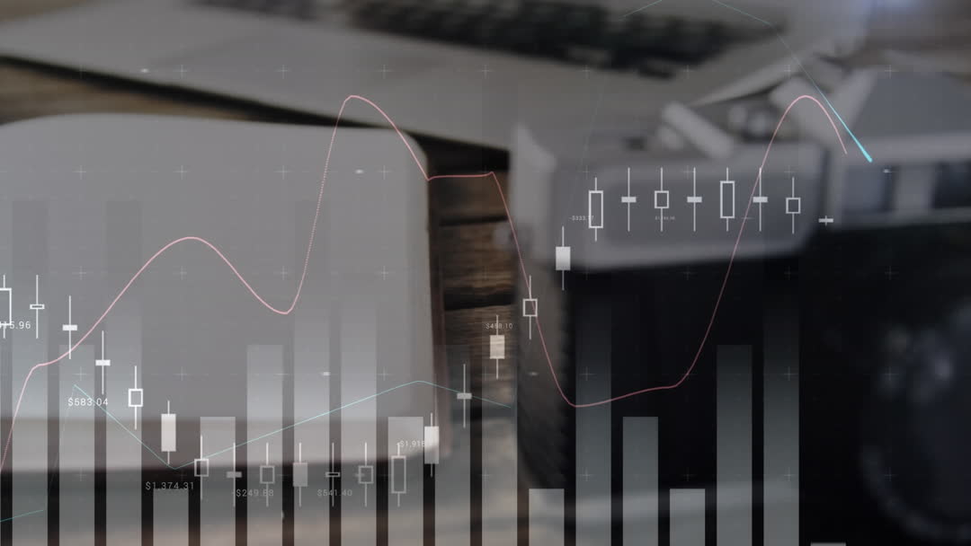 Illustrates the intersection of technology and finance by overlaying digital financial graphs over a desk featuring a camera, laptop, and notepad. Useful for conveying concepts in data analysis, modern business operations, and the digitization of industries in presentations or websites related to finance, technology, and innovation.