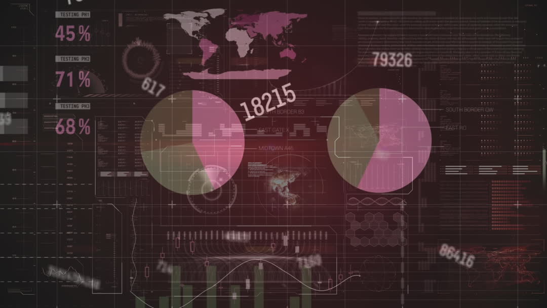 Video animation showcases various digital elements including pie charts, graphs, and a world map, all in a dynamic interface suited for global business or tech themes. Perfect for illustrating data analysis processes in presentations, marketing materials, or tech-related content, conveying a sense of modernity and sophisticated technology.