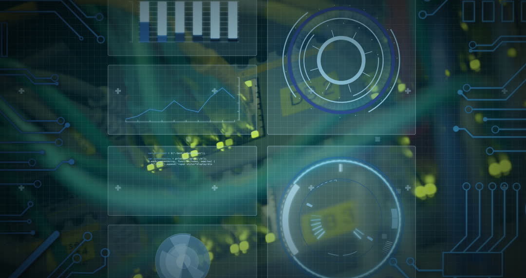 Image features virtual elements such as graphs and analytics tools layered over a network background, depicting a digital interface used for processing and analyzing data. Ideal for use in presentations, websites, or articles discussing technology, data science, financial analytics, and digital transformation.