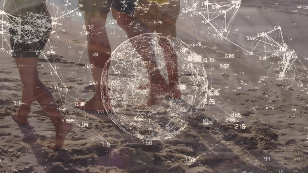 This creative video shows a digital network and data connections superimposed over people walking on a sunny beach. Their legs are visible with sandy background, convoking a sense of technology merging with daily life. Ideal for illustrating technological advancements, digital transformation concepts applied to everyday scenarios, or discussions for innovation in leisure and travel industries.