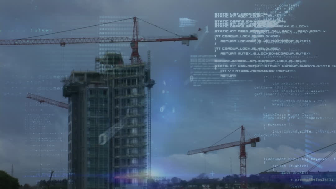 Animation depicts technological data overlay integrated with modern construction processes. Showing a city skyline with prominent skyscrapers and tower cranes, ideal for presentations on digital transformation in architecture, smart cities, urban planning, fusion of technology with construction, or educational resources on tech-driven building strategies.