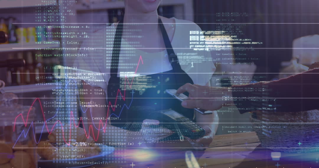 Digital data codes overlaying a scene with people using a payment terminal signifies advanced technology and modern financial solutions. Ideal for illustrating topics related to financial technology, digital transactions, or innovations in ecommerce. This depiction can enhance marketing materials, presentations, or articles focused on integrating technology in consumer services.