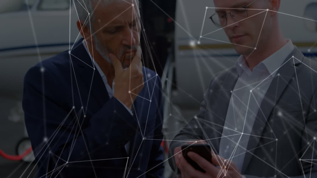 Two businessmen looking at a smartphone while engaging in a thoughtful discussion. Overlays of digital data lines create a tech-oriented motif, indicating a blend of modern technology with business strategy. Ideal for use in presentations that focus on tech advancements in business, corporate innovation, or future trends in digital communications.