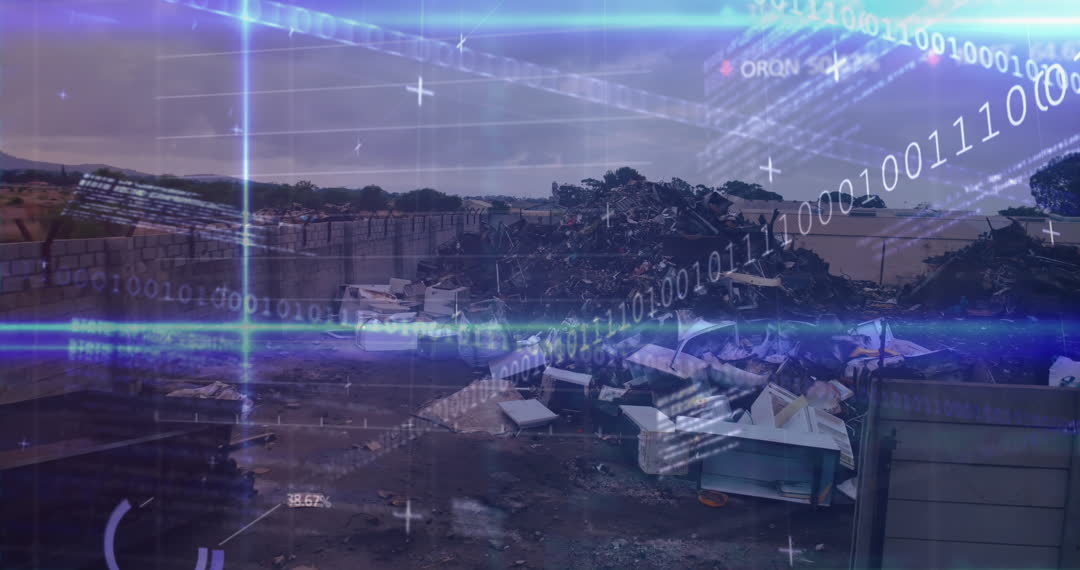 Conceptual visualization showing the intersection of digital technology with environmental impact, capturing a pile of trash juxtaposed with data processing graphics. Ideal for topics on digital solutions, technology’s role in recycling, or green technology advancements.