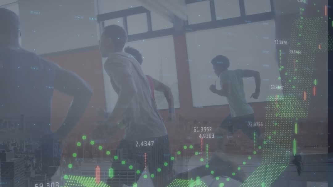 Young athletes running in a gym with an animated overlay of stock market and data graphics, creating a dynamic blend of fitness and digital technology. Useful for illustrating concepts in health tech innovation, data analysis in sports, or integrating business with physical fitness.