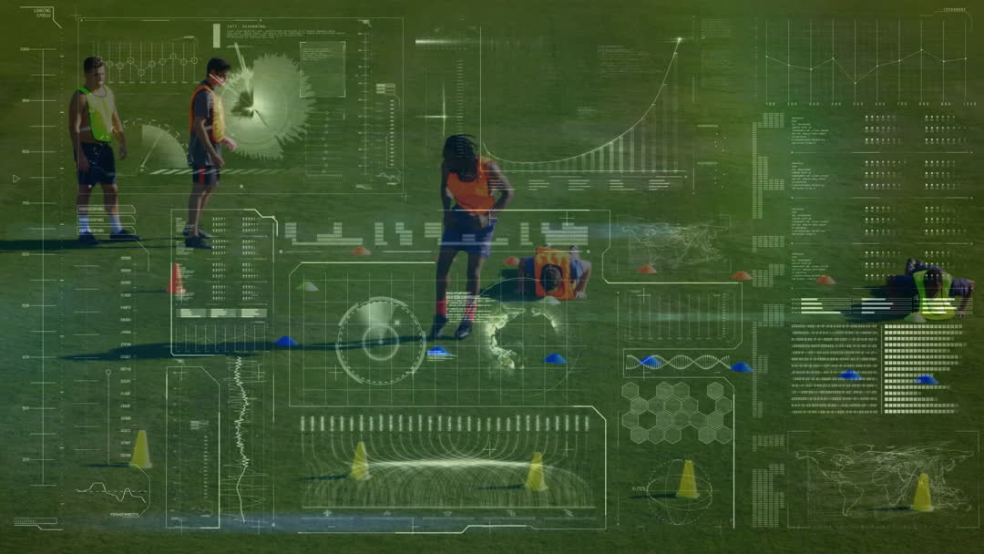 Digital Data Overlay on Soccer Players Practicing on Field Video