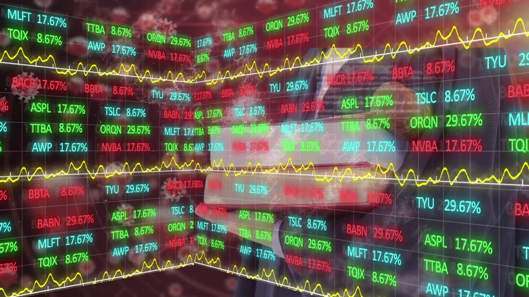 Visual representation of financial market data merged with virus cell videory, symbolizing economic challenges during global pandemics. Useful for illustrating the impact of health crises on financial systems, articles on digital technology in economic monitoring, and presentations on economic volatility during global events.