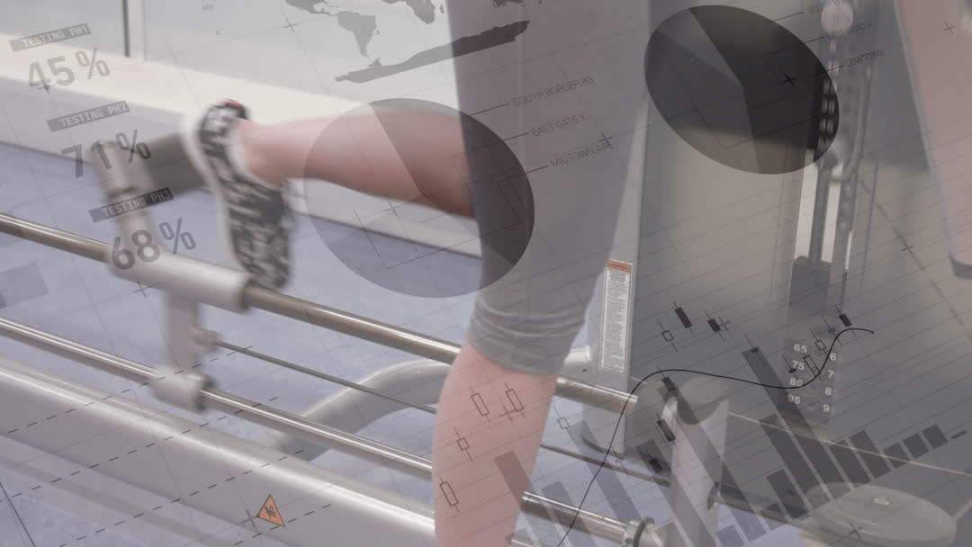 Caucasian woman on exercise equipment as digital data graphics overlay video. Illustrated numbers and graphs suggest real-time monitoring, great for articles on fitness tech, health apps, or sports analysis.