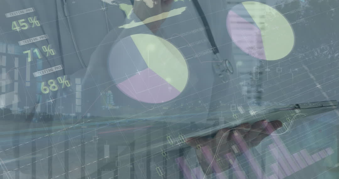 A doctor is interfacing with digital analytics displayed on a tablet, featuring pie charts and data percentages. This visual exemplifies modern healthcare interactions with data, suitable for illustrating concepts of medical technology advancements, telemedicine strategies, or healthcare decision-making based on data insights.