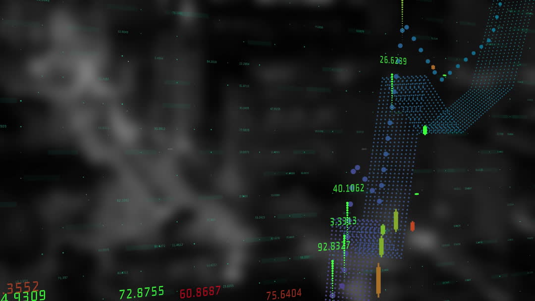 Stylized abstract illustration features digital data projected over an indistinct background, simulating the dynamic environment of financial analysis and global business operations. Suitable for presentations, articles, and graphics related to advanced analytics, data integration, or futuristic business solutions.