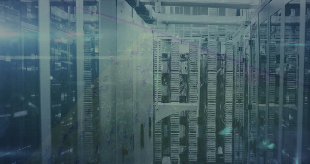 Stylized visual shows data processing animations over a background of a server room. Ideal for use in presentations, articles, or marketing materials related to technology, IT infrastructure, or network management. Can illustrate concepts of digital transformation and connectivity in a visually engaging manner.