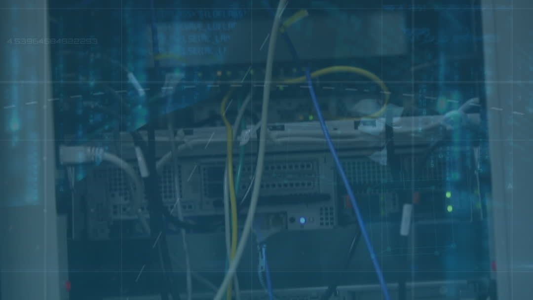 This animation illustrates various elements of data processing and cybersecurity by showcasing a server room with interconnecting wires and an overlay of information processing effect. This video can be ideal for use in presentations regarding information technology, cybersecurity awareness, or during discussions related to data safety protocol transformations. It effectively conveys modern cybersecurity challenges and concerns within a technological environment.