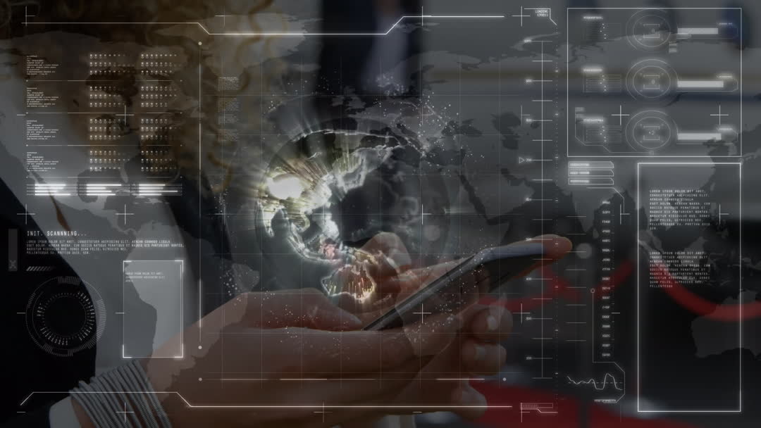 The video illustrates the concept of digital data processing with a smartphone and a transparent interface displaying financial data. The integration of high-tech graphics suggests the use of advanced technologies in financial analysis or global data sharing. It is useful for articles or promotions related to mobile technology, fintech, innovative data solutions, and global financial markets.