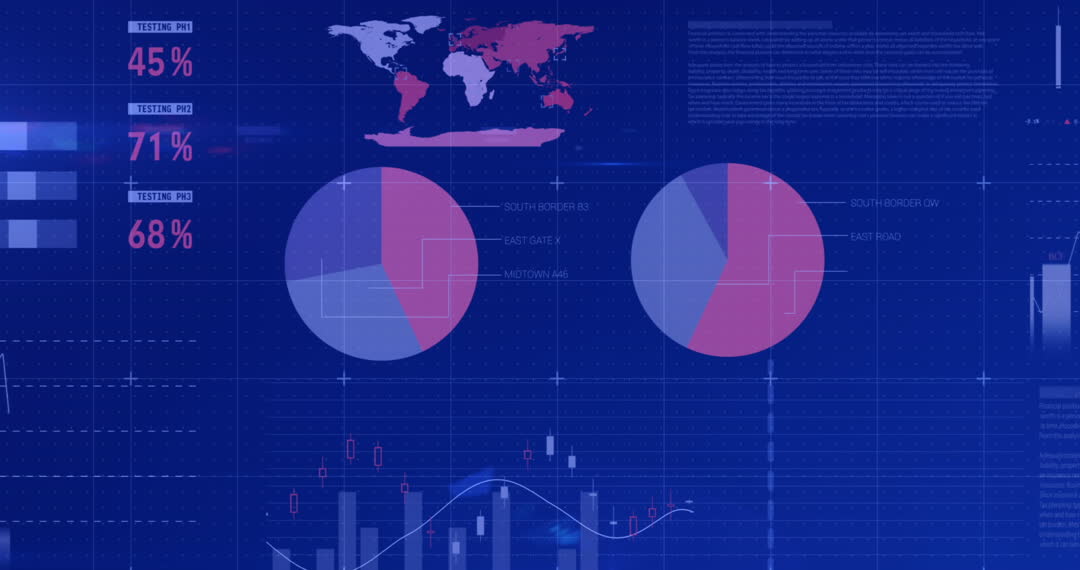Dynamic representation of digital data processing with analytical charts and graphs set against a blue background. Useful for illustrating concepts related to global business, digital interfaces, and analytical strategies in business presentations and educational content.