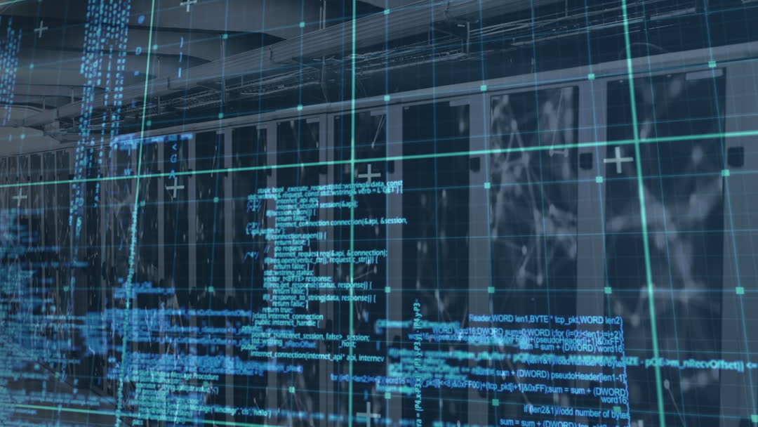 Graphic showcasing digital data processing overlaying server racks, representing intersection of technology and cybersecurity. Suitable for media on digital transformation, IT solutions, cybersecurity initiatives, and technological innovation.