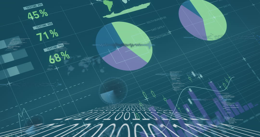 Image depicts abstract representation of data processing and analysis, showcasing binary numbers and charts. Useful for illustrating concepts related to technology, finance, and analytics for presentations, reports, or digital content.