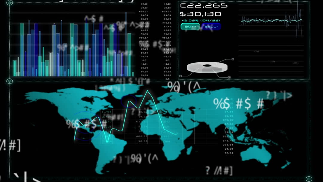 Dynamic visualization shows data processing in a global context, suitable for presentations related to international business, analytics, finance, or technology. Elements like graphs, charts, and world maps highlight global connectivity and data flow, making it useful for websites, presentations, or educational resources focused on digital interfaces and data visualization.