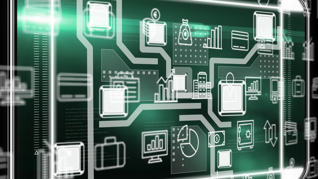 This visually engaging video illustrates the concept of data processing technology on a digital interface with a futuristic touch. Points of data flow through networks of interconnected components, highlighting elements like charts, graphs, and symbols representing financial growth and technological advancements. Use it to convey themes in technology-driven marketing materials, IT presentations, and articles about digital innovation and big data analysis.
