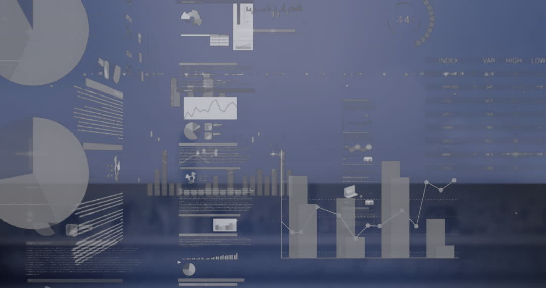 Animation features various digital data elements such as charts, graphs, and interface icons overlaying a landscape. Ideal for use in technology, financial, and data-driven presentations. It can also serve as a visual backdrop for innovation-themed marketing materials or educational content on data analytics.
