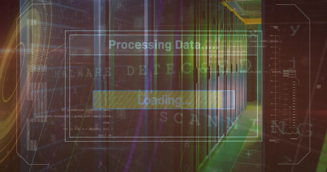 This video shows a digital animation of data processing and a loading bar overlaid on a scene of server racks. The high-tech visualization suggests concepts such as cybersecurity, data management, and IT infrastructure. This can be used for illustrating articles or presentations on data centers, network security, and technology advancements.