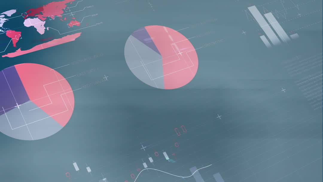 Abstract background showcases data processing with animated charts and graphs blending into the scene. Suitable for illustrating concepts in global business, digital analytics, or financial markets in presentations, websites, and educational materials.