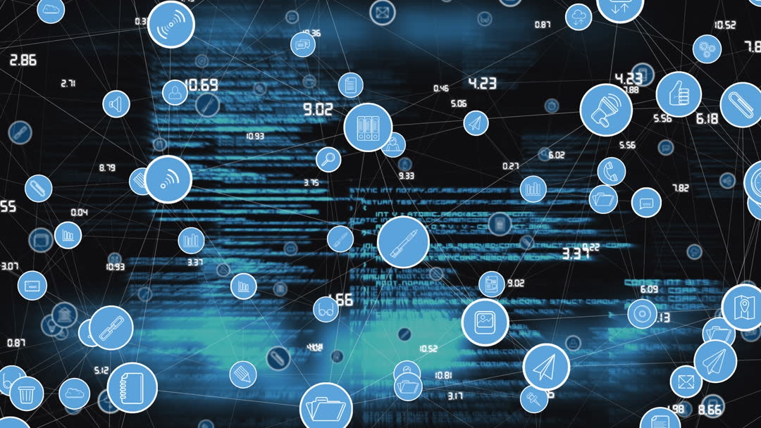 Digital data processing and network nodes depicted through animated blue icons over a dark abstract background. This visualization is ideal for representing concepts like global communication, information technology, cybersecurity, connectivity, and modern business solutions. It can be used in presentations, educational materials, technology conferences, or promotional content for tech companies to highlight advancements in data handling and interconnected systems.