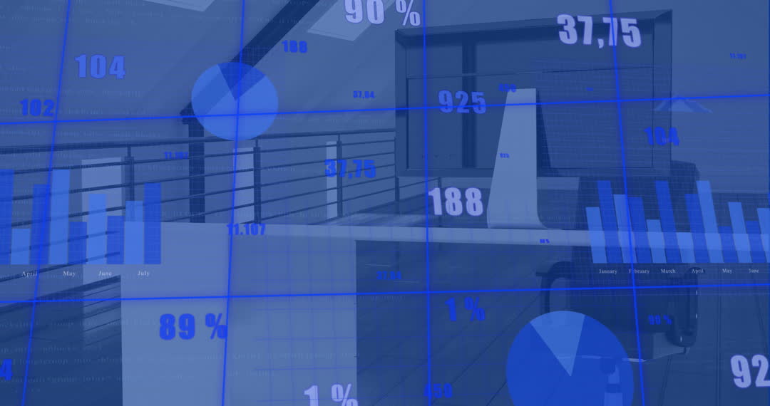 Numerical and graphical data overlay depicts analysis and processing themes in a contemporary office environment. Ideal for illustrating articles and presentations on technology, business intelligence, and corporate analytics. Suitable for use by financial analysts and tech firms.