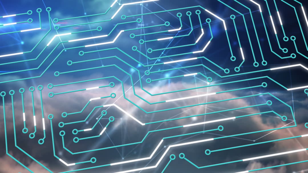 Features animated data processing visuals with a circuit board pattern overlay on a blue backdrop and clouds. This digital concept symbolizes technology, innovation, and global connections, ideal for use in tech-related presentations, marketing materials, and visual content for illustrating concepts of networking and data management in various industries.