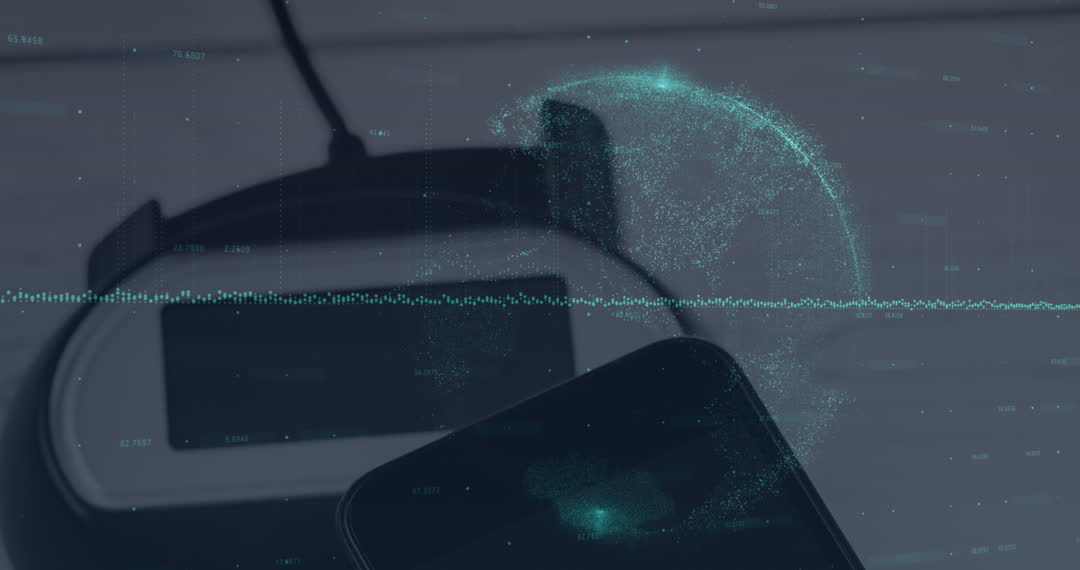 Abstract portrayal of digital data processing hovers dynamically over a graphical video of a globe and electronic devices, symbolizing innovation and connectivity in business technology. Ideal for technology websites, global digital transformation content, and futuristic business presentations focusing on data processing and digital networking themes.