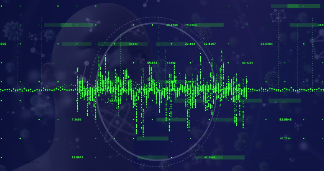 Displaying a visualization of complex data analysis related to covid-19, molecular structures are seen alongside a silhouette of a human head, illustrating emerging trends in medical research and science. Useful for presentations on technology in healthcare, advancements in data analytics, and studies related to infectious diseases.