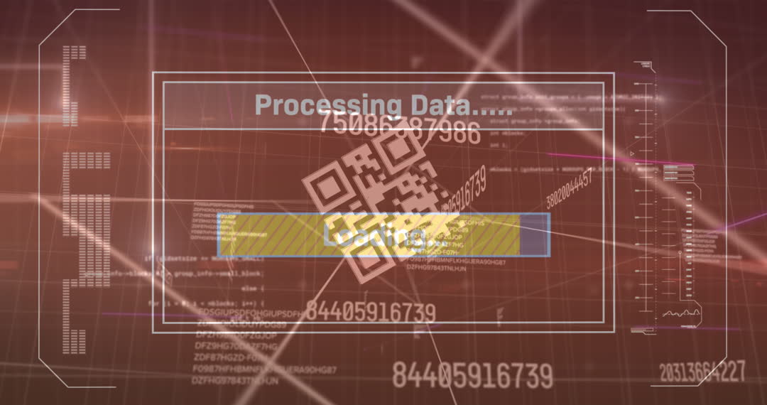 Visual depicts animated data processing sequence with technical interface highlighting global business interaction. Elements like QR code and coding snippets enhance technological theme, ideal for content about software development, IT, data analysis, and tech presentations. Red background adds dynamic and futuristic appeal.
