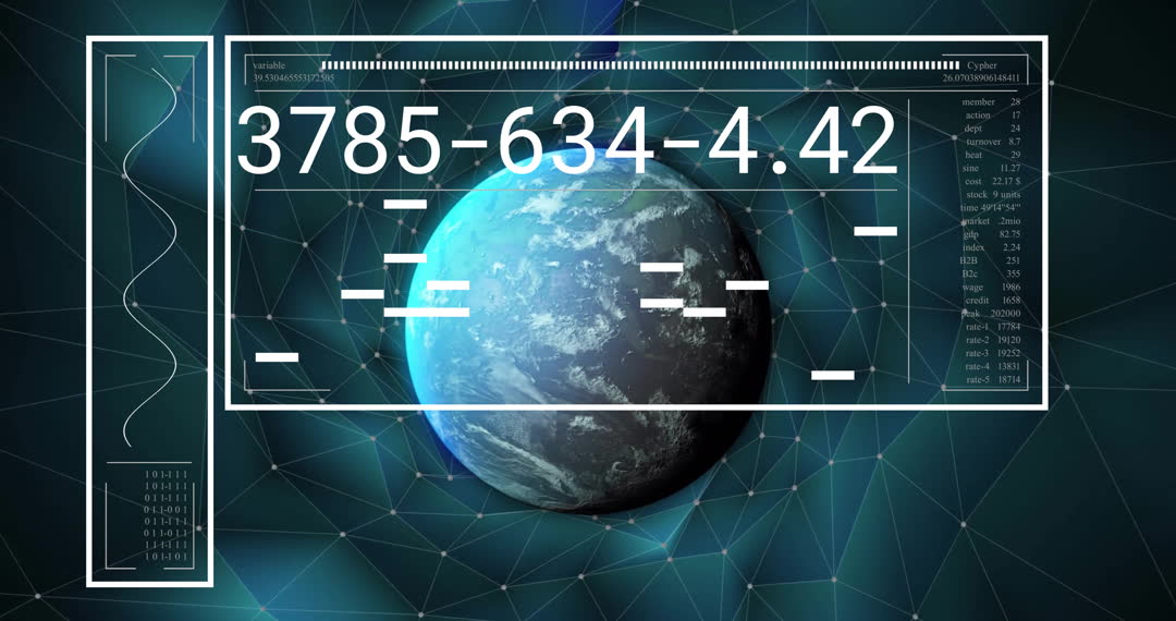 Abstract digital backdrop with a globe surrounded by data processing vectors and numbers. This visual conveys themes of global connectivity and technology advancements. Useful for presentations on digital topics, tech blogs, or information systems tutorials.