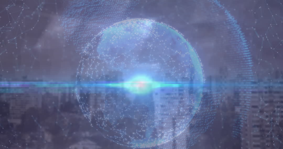 Digital Data Processing on Cityscape with Globe Overlay Video