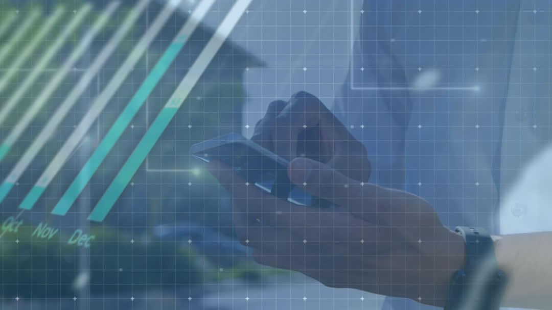 An videory of hands interacting with a smartphone, overlaid with a digital grid and graphics representing data and analytics. The fusion of technology and finance is emphasized, making it suitable for illustrating topics in digital marketing, fintech developments, business reports, or tech innovations. This concept suits articles, presentations, or websites themed around digital transformation or mobile technology advancements.