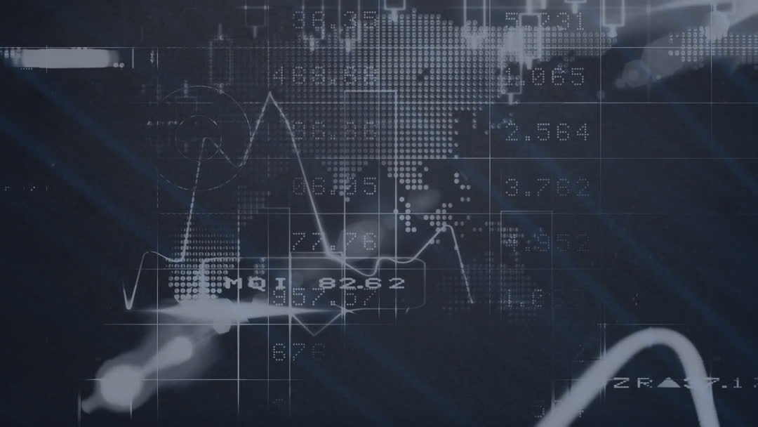 Futuristic visualization of digital data processing overlays numbers and graphs on a world map background. The animation embodies a high-tech, cyber interface often used for projects in analytics, digital marketing presentations, cybersecurity courses, tech lingo education, or illustrating global business and finance concepts. This would be useful for showcasing modern digital communication methods or enhancing content about big data and tracking systems.