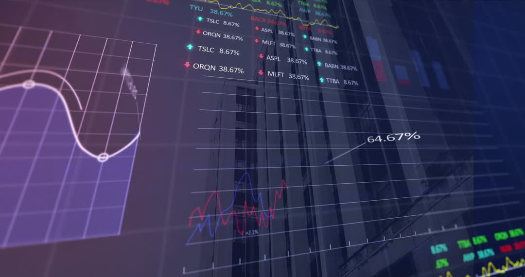 The animation overlays dynamic digital financial graphs and data metrics over an urban cityscape, conveying concepts of technology integration in global business practices. Ideal for usage in wilds technology features, articles focusing on urban economic analysis, or public-fakeunda scenarios illustrating the rise of the digital economy.