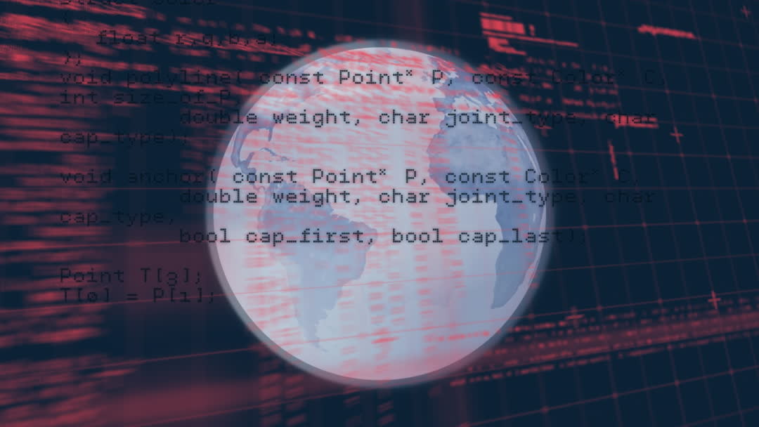 Visual depicting animated concept of digital data processing and computer programming languages superimposed on a rotating globe. Suitable for use in illustrating concepts of global communication, technology infrastructure, software development, data management, and cybersecurity in digital media and presentations.