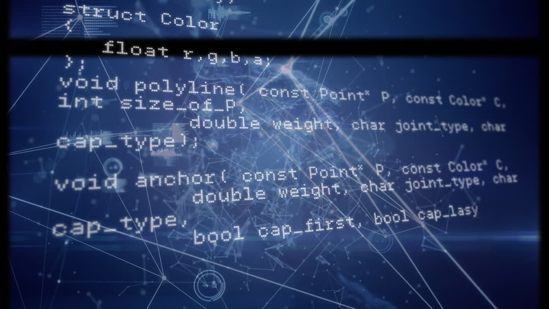 This visualization of data processing and network connections on a blue background symbolizes global technology and communications. It displays programming code intersecting digital links which indicate the interconnected nature of modern computing. Ideal for illustrating concepts in computer programming, software development, online connections, technology innovations, or digital interfaces. Perfect for use in presentations, educational material, and discussions about digital transformation and futuristic technology trends.
